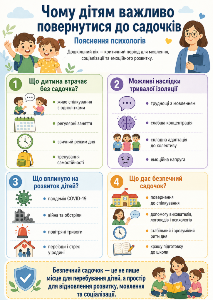 Психологи наголошують: дошкільний вік — це не лише підготовка до школи. Саме в цей період дитина активно вчиться говорити, будувати прості діалоги, слухати дорослого, взаємодіяти з однолітками, дотримуватися правил і поступово ставати самостійнішою. Вдома навіть уважні батьки не завжди можуть замінити повноцінне дитяче середовище. Для дітей це можливість повернути зрозумілий режим, живе спілкування, заняття з вихователями, підтримку логопедів, психологів та інших фахівців. А для батьків — шанс вчасно побачити проблеми розвитку і не залишатися з ними сам на сам.