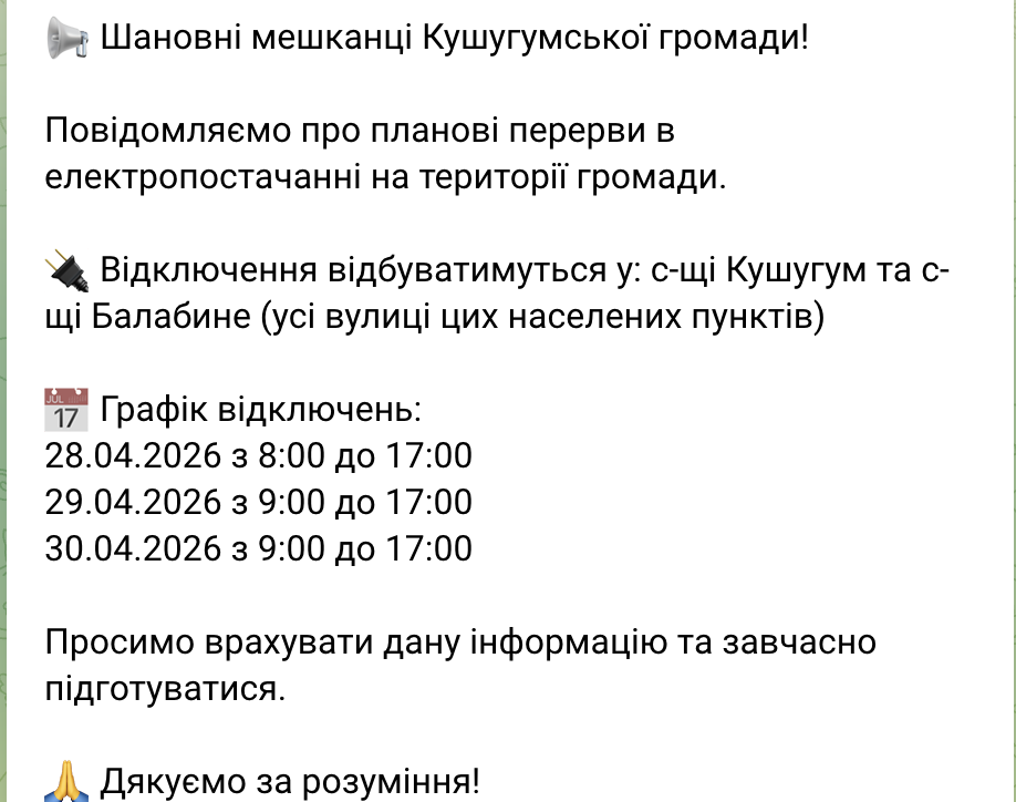 Мешканці Кушугумської громади мають готовитися до планових відключень електроенергії. Графік діє протягом трьох днів у селищах Кушугум та Балабине.
